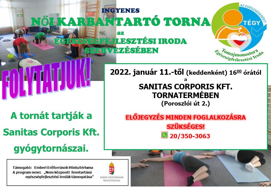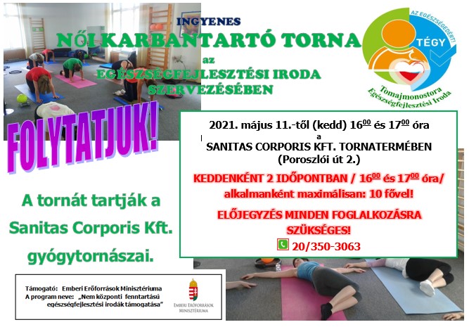 Rendszeres, életvitelszerűen megjelenő testmozgás, közösségi program középkorú és idős nők számára. Előzetes igényfelmérés szerint gyógytorna gyakorlatokat a testnevelés elemeivel vegyítő egyórás foglalkozás.